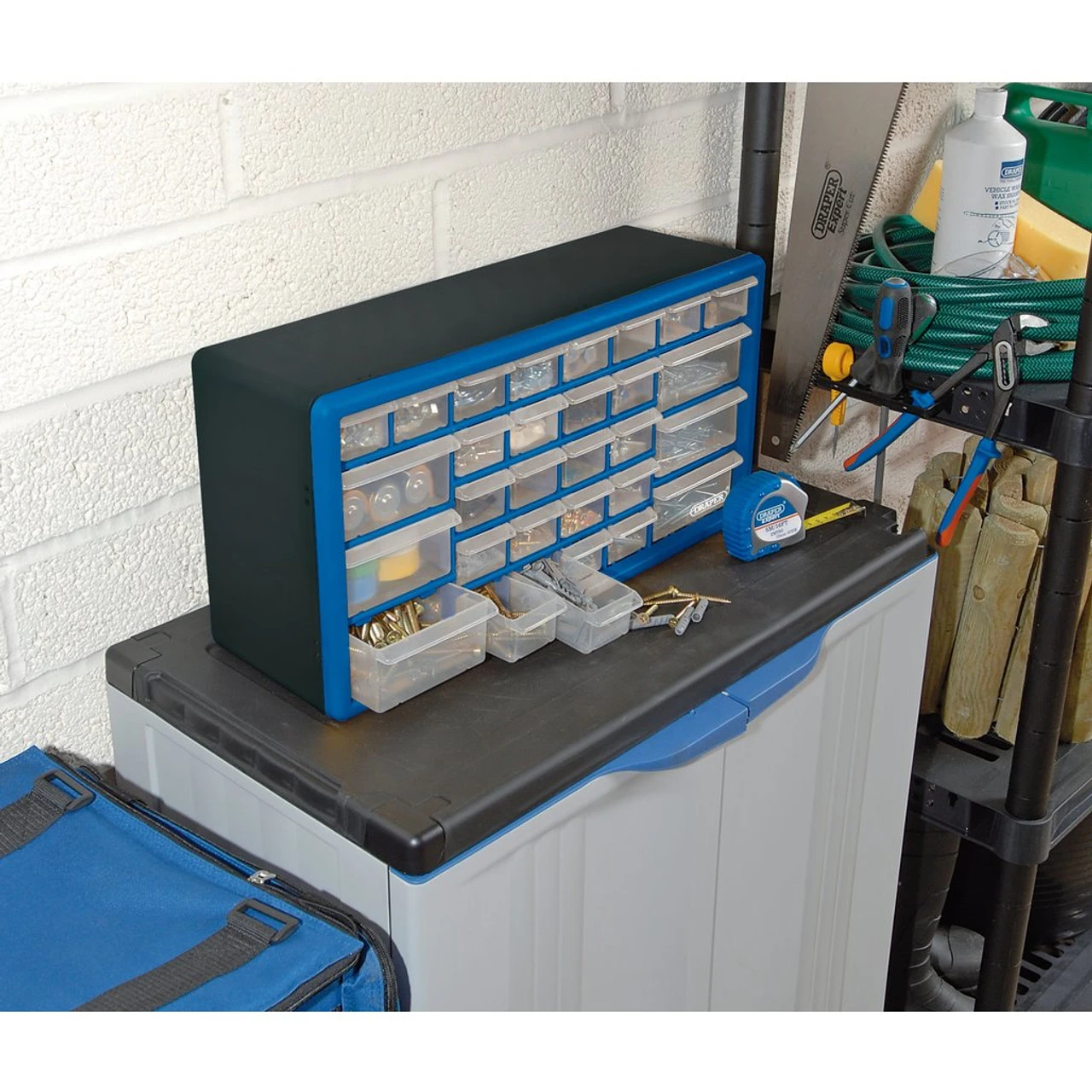 Impact-resistant plastic ideal for use in the workshop or home. Latching facility to prevent drawer fall out. Slotted holes in cabinet to facilitate wall mounting. Shrink wrapped with display sleeve.