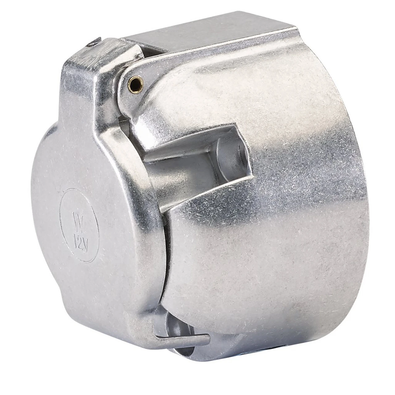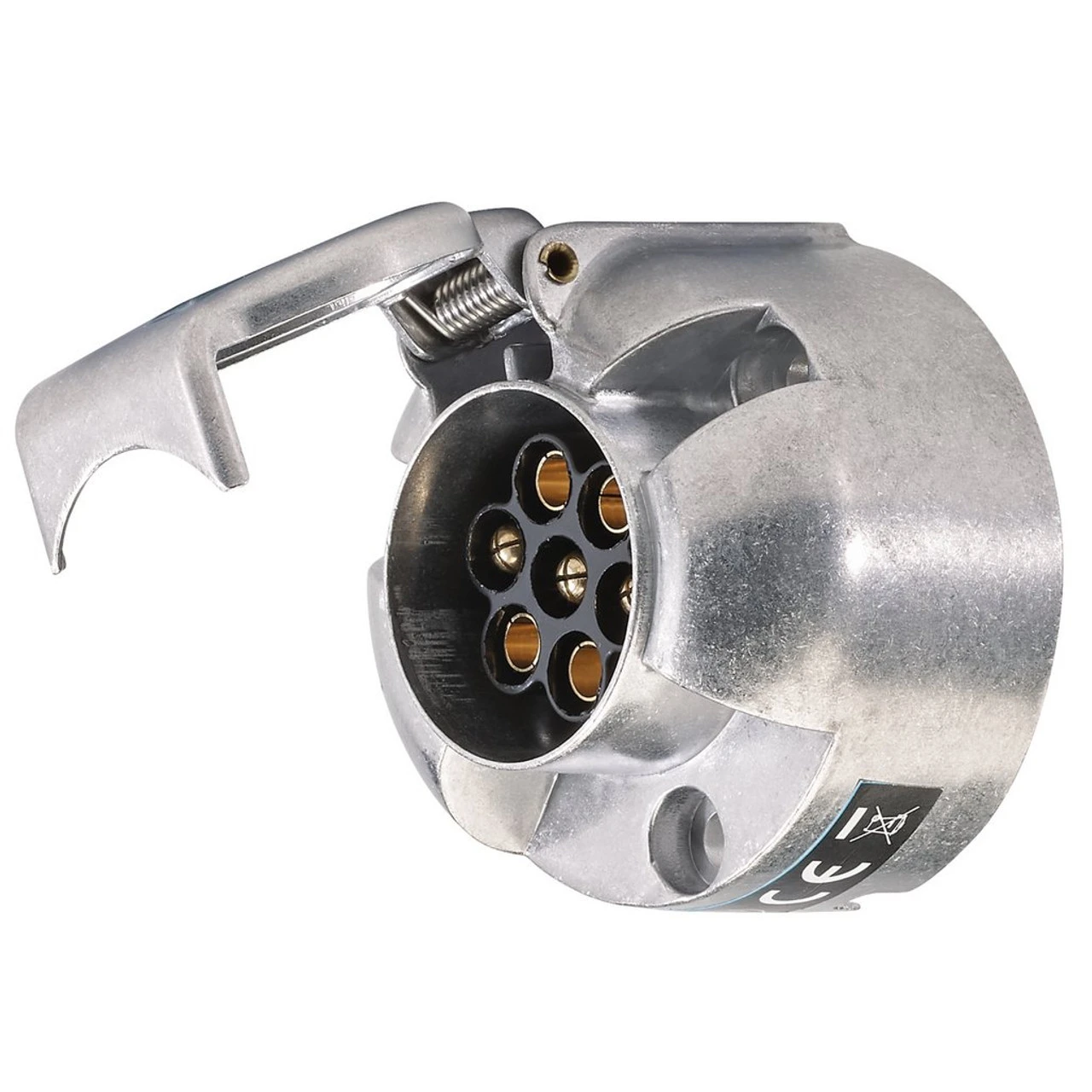 7-pin towing socket fitted with sprung loaded socket cover. The weatherproof sprung cover protects the connections when not in use and locks the 7-pin plug when in use.
