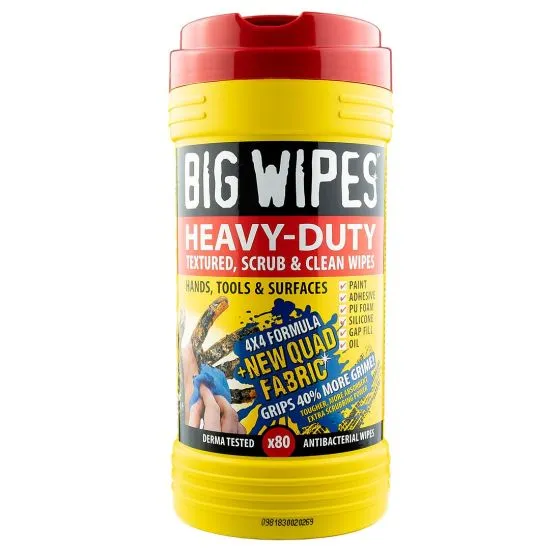 BIG WIPES Red Top 4×4 Heavy-Duty Multi-Purpose Hand Cleaners have a formula that is tough on grime and kind to hands. They are bigger, thicker and tougher than before. These are simply the best hand cleaning wipes on the market! Incorporating the latest high adhesion web technology, the innovative dual sided scrub and clean Quad Fabric from Big Wipes grips 40% more grime with every wipe, so you can mop up even the toughest dirt in the quickest time. The abrasive side removes the most stubborn and dried-on filth, while the smooth side soaks up any excess, leaving no mess. The firm grip, no slip textile ensures reduced slippage, high tear resistance and no pilling.