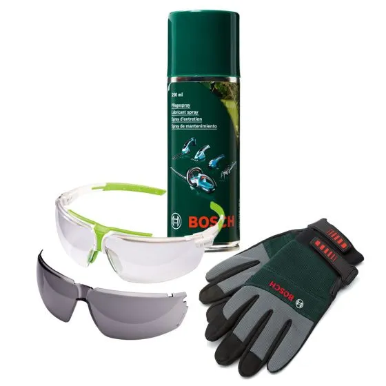 Bosch Green Wood Care Safety Kit inc Gloves, Glasses & Lubricant Spray for Keo, ASB/AGS, Isio and AHS Blades 1600A00ZZ8
