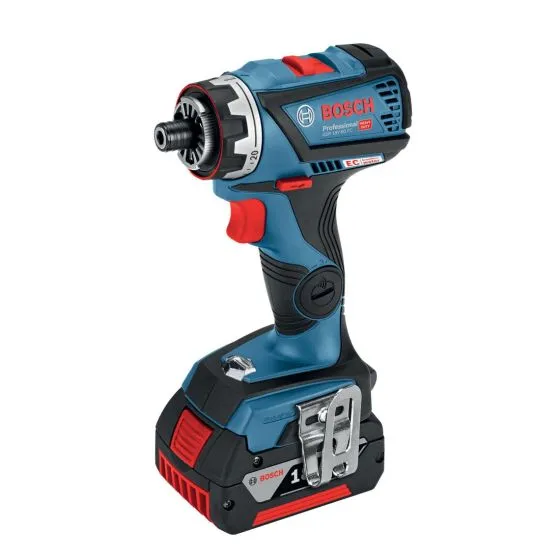 Bosch GSR18V-60FCC FlexClick Drill Driver 18v provides the optimum solution in most working areas around the site. At just 140mm in length, this drill driver’s compact tool dimensions are suited to operation in tight spaces, and with the addition of flexible adaptors, it reaches even further. Its exceptional application versatility enables drilling in wood, metal and even concrete, as well as classic screwdriving.
