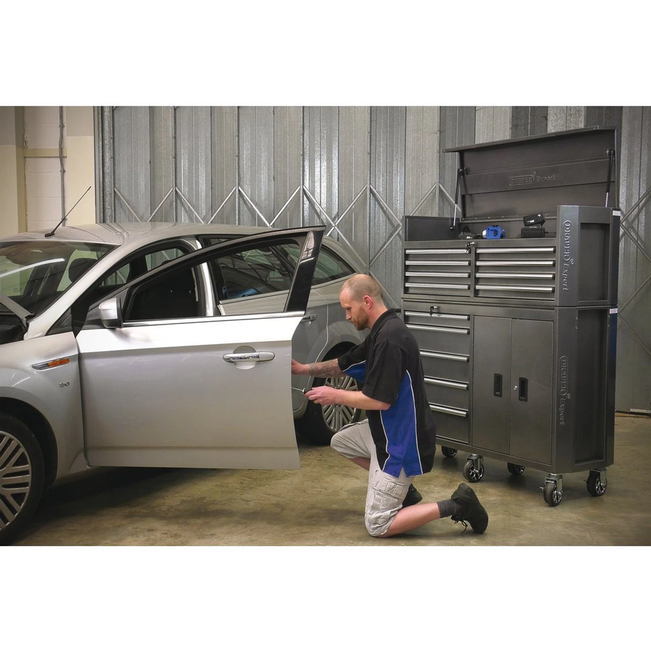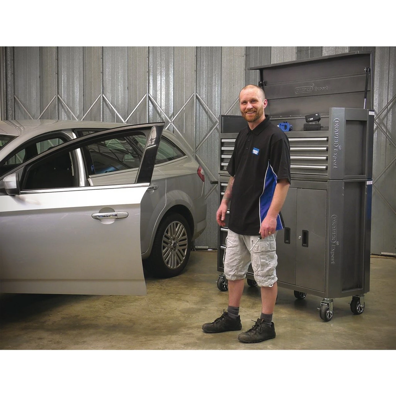 Expert Quality, thirteen drawers metallic silver combined roller cabinet and tool chest. Attached with braked and swivelling castors and soft grip pulling handles for easy manoeuvrability. The reinforced lid is fitted with supportive gas struts anda cable access hole. Manufactured from thick sheet steel with a protective powder coated finish. Drawers are fitted with aluminium trim, 3mm EVA foam linings, secure locking system with two keys and auto retention ball bearing runners delivering smoother operation. Each tool cabinet is also Supplied with an EVA top mat on a pallet.