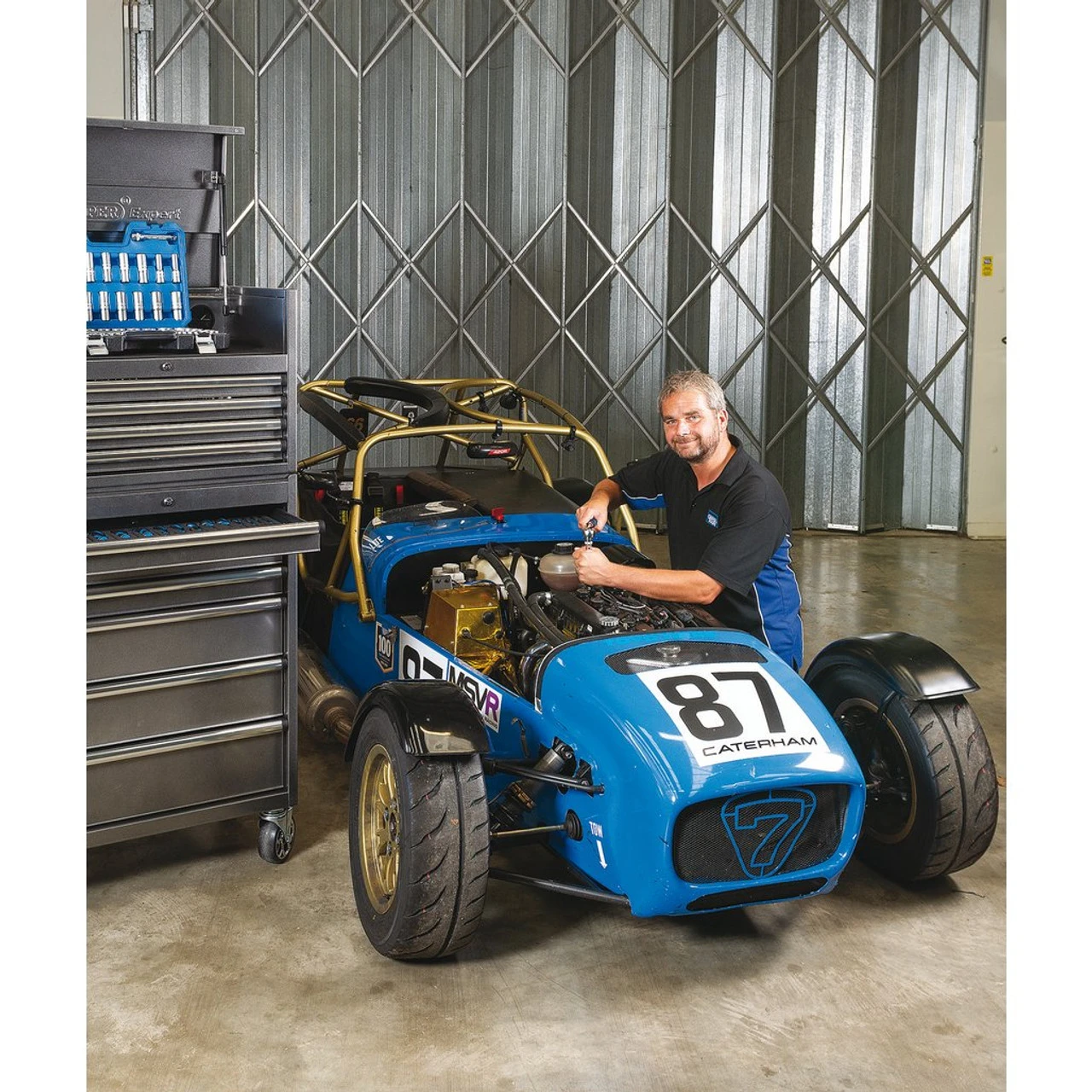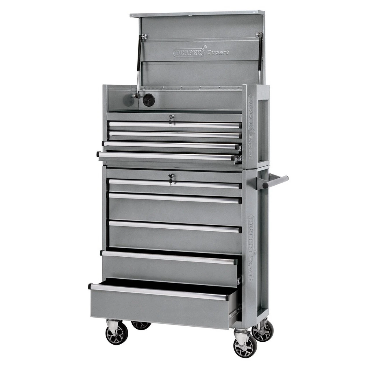 Expert Quality, nine drawers metallic silver combined roller cabinet and tool chest. Attached with braked and swivelling castors and soft grip pulling handles for easy manoeuvrability. The reinforced lid is fitted with supportive gas struts andacable access hole. Manufactured from thick sheet steel with a protective powder coated finish. Drawers are fitted with aluminium trim, 3mm EVA foam linings, secure locking system with two keys and auto retention ball bearing runners delivering smoother operation. Each tool cabinet is also Supplied with an EVA top mat on a pallet.