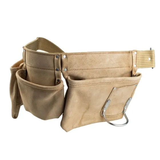 Kuny’s Carpenters Apron made from suede leather with a 50mm/2″ wide heavy-duty nylon web belt, comes with metal twist-lock buckle, metal hammer loops and reinforced at all stress points. 3 reversed nail pockets for easy access, (2 large and 1 small) and a centre pocket for tape or tools and 2 small pockets for easy access tools.