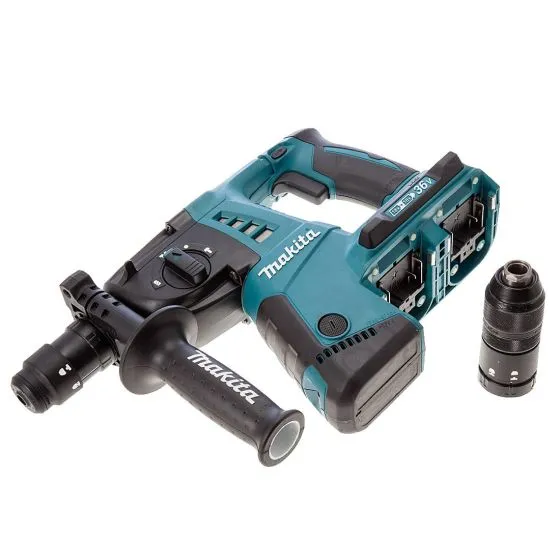 The Makita DHR264 is a 26mm cordless SDS+ plus rotary hammer drill based on model BHR262T but powered with 2x 18v batteries giving the equivalent power of a 36v machine. Also comes with a quick change chuck to allow for the use of standard straight shank drill bits.