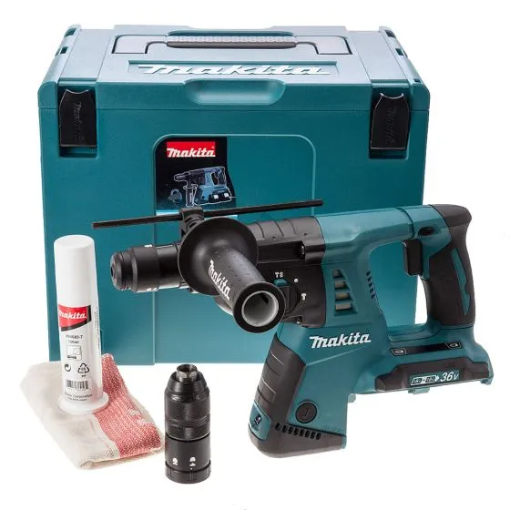 The Makita DHR264Z is a 26mm cordless SDS+ plus rotary hammer drill based on model BHR262T but powered with 2x 18v batteries giving the equivalent power of a 36v machine. Also comes with a quick change chuck to allow for the use of standard straight shank drill bits.