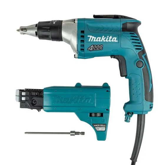 The Makita FS4300JX2 is a super heavy duty drywall plasterboard screwdriver with a max no-load speed of 4,000 RPM. It comes complete with a magnetic socket bit holder and Phillips driver bit along with the 199146-8 Collated Autofeed Screwdriver Magazine Attachment – all packed in a MAKPAC type 1 carry case.