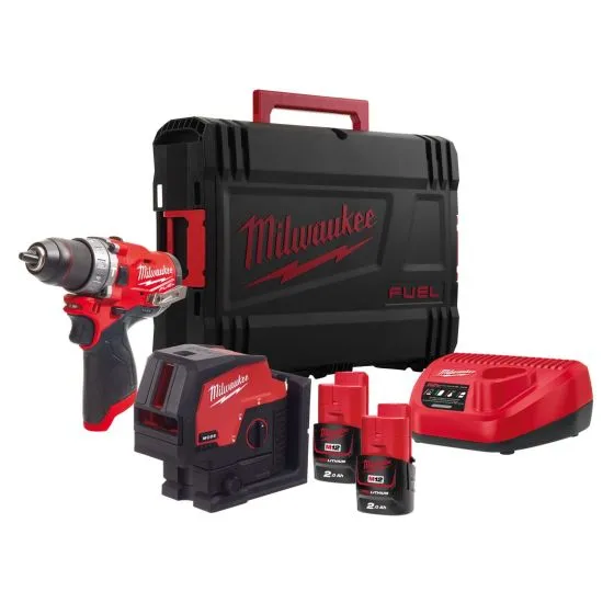 Milwaukee M12 FPP2BB-202X 12v Combi Drill & Cross Line Laser Kit Inc 2x 2.0Ah Batteries, 1x Charger & Carry Case 4933478988