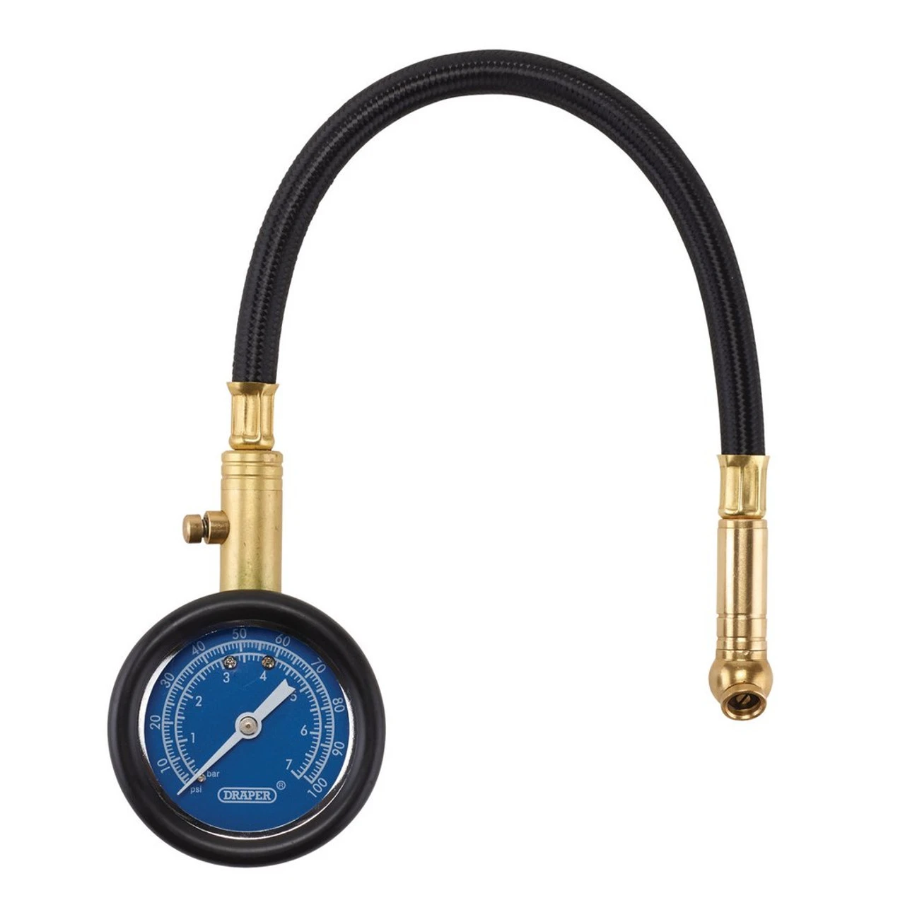 Hand-held dual reading gauge with flexible 250mm long hose. Swivel angled tyre connection and air release valve. Large easy-to-read scale graduated 5 – 100psi in 1psi increments and 0.3 – 7bar in 0.1bar increments.
